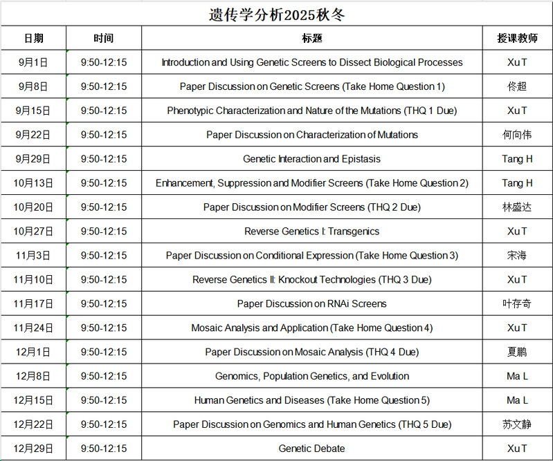 2025-2026年“遗传学分析”课程安排