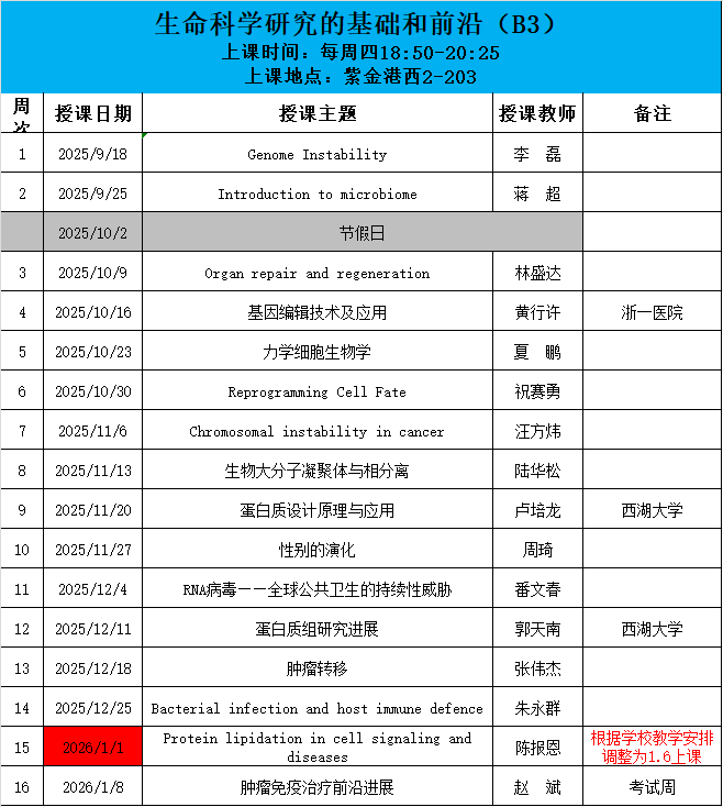 2025-2026年“生命科学研究的基础和前沿”课程安排
