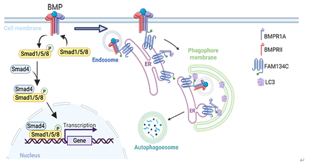 2025年10月20日,实验室研究方向二冯新华实验室在The EMBO Journal上在线发表了题为《Reticulophagy receptor FAM134C restrains BMP receptor signaling》的研究论文。该研究首次发现,内质网自噬受体FAM134C可通过一条独立于ER-phagy的全新机制,选择性介导Ⅰ型骨形态发生蛋白受体BMPRIA的降解,从而精确“刹车”BMP信号通路,为理解自噬与发育信号交互调控提供了崭新视角。